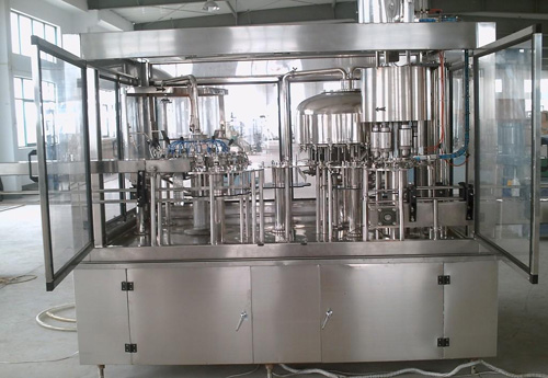 瓶子由通过风送道传递,然后通过拨瓶星轮传送至三合一机的冲瓶机。冲瓶机回转盘上装有瓶夹,瓶夹夹住瓶口沿一导轨翻转180°,使瓶口向下。在冲瓶机特定区域,冲瓶夹喷嘴喷出冲瓶水,对瓶子内壁进行冲洗。瓶子经冲洗、沥干后在瓶夹夹持下沿导轨再翻转180°,使瓶口向上。洗净后的瓶子通过拨瓶星轮由冲瓶机导出并传送至灌装机。进入灌装机的瓶子由瓶颈托板卡住并在凸轮作用下将瓶子上升,然后由瓶口将灌装阀顶开。灌装采用重力灌装方式。灌装阀打开后物料通过灌装阀完成灌装过程,灌装结束后瓶口下降离开灌装阀,瓶子通过卡瓶颈过渡拨轮进入旋盖机。旋盖机上的止旋刀卡住瓶颈部位,保持瓶子直立并防止旋转。旋盖头在旋盖机上保持公转并自转,在凸轮作用下实现抓盖、套盖、旋盖、脱盖动作,完成整个封盖过程。成品瓶通过出瓶拨轮从旋盖机传送到出瓶输送链上,由输送链传送出三合一机。